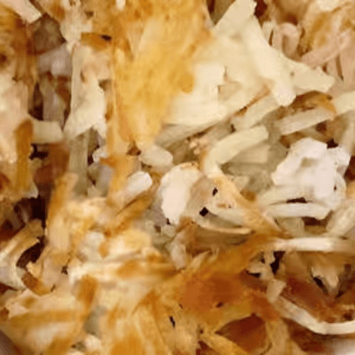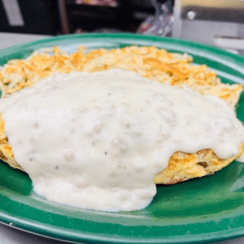 With hash browns, chopped sausage and cheese topped with homemade sausage gravy. Made with three farm-fresh eggs. Served with hash browns, toast and jelly