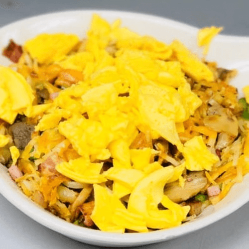 Made with hash browns, ham, sausage, green peppers and onions. Seasoned and grilled to perfection, topped with shredded Cheddar cheese and two eggs, any style. Served with your choice of a buttermilk biscuit or toast and jelly