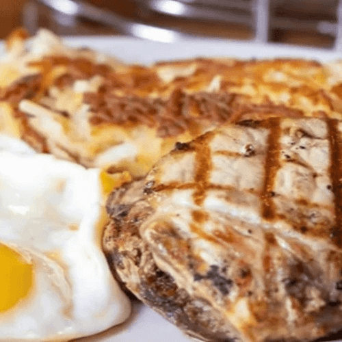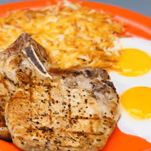 Two pork chops, center-cut for tenderness, served with two eggs, any style, hash browns, toast and jelly