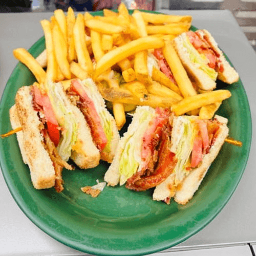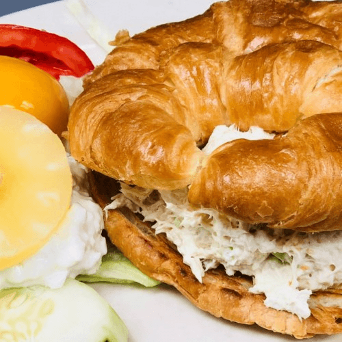 A delicious assortment of our homemade tuna salad or chicken salad accompanied by coleslaw, cottage cheese, green pepper, olives, onion, sliced egg and cucumber