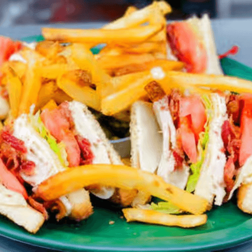 Layers of ham, turkey and thinly sliced roast beef with American cheese, lettuce, tomato and mayo between three layers of toast