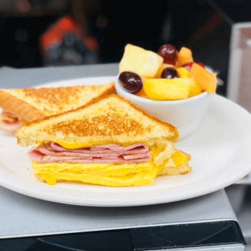 Made with diced ham, onions, green peppers and American cheese. Made with three farm-fresh eggs. Served with hash browns, toast and jelly