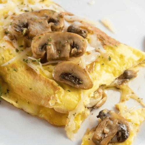 Filled with mushrooms and Swiss cheese. Made with three farm-fresh eggs. Served with hash browns, toast and jelly