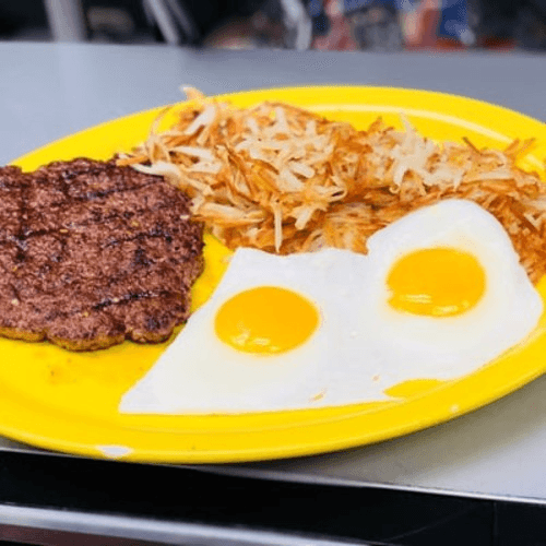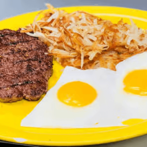 Lean chopped steak teamed with two fresh eggs, any style, hash browns, toast and jelly