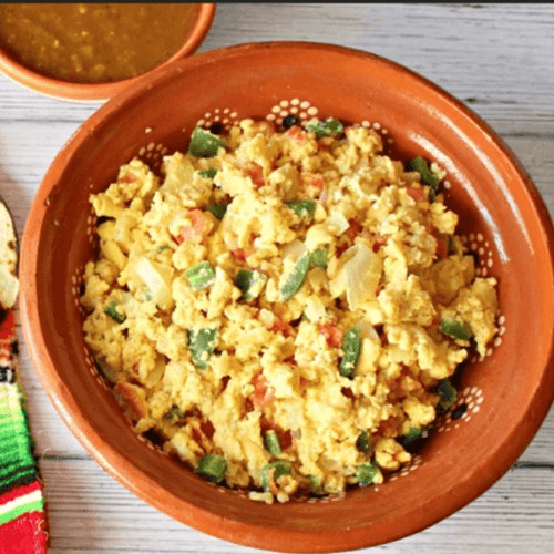 Mexican-style scrambled eggs mixed with tomatoes, onions, green peppers and cheese then topped with homemade salsa. Served with hash browns and buttered toast and jelly