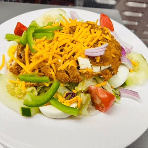 Mixed greens topped with your choice of grilled or fried chicken strips, hard-boiled egg, cucumber, tomato, onion and shredded Cheddar cheese