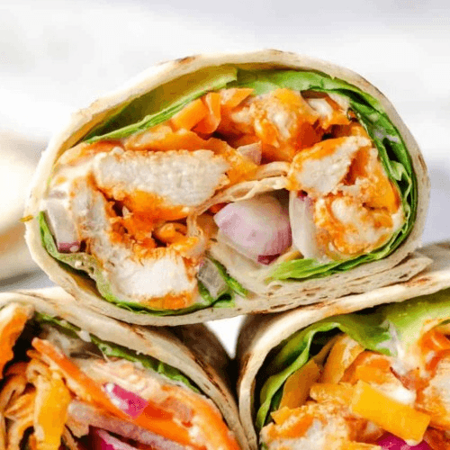 Layers of ham, turkey and thinly sliced roast beef with American cheese, lettuce, tomato and mayo all wrapped up in a fresh flour tortilla