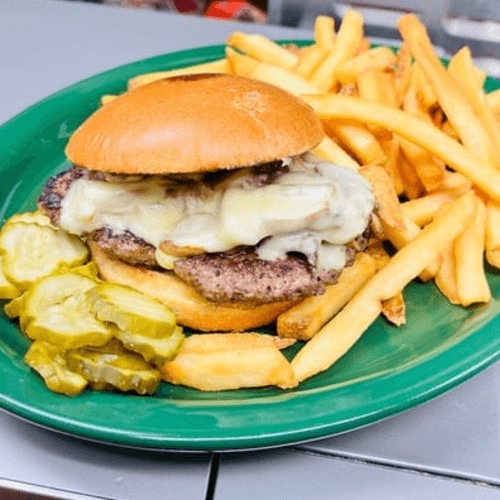 Our juicy burger topped with grilled onions, mushrooms, green peppers and mozzarella cheese. Served with lettuce, tomato, onion and mayo upon request