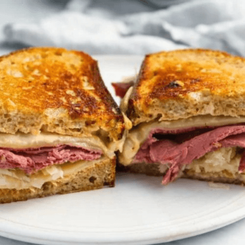 Corned beef, sauerkraut and Swiss cheese on grilled rye bread