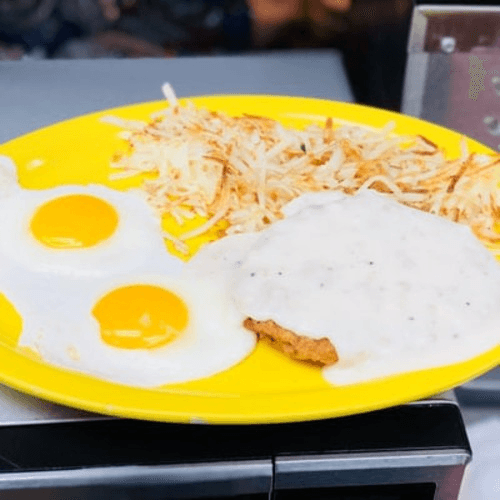 Two large eggs, any style served with tender country fried steak smothered with country gravy. Served with hash browns, toast and jelly