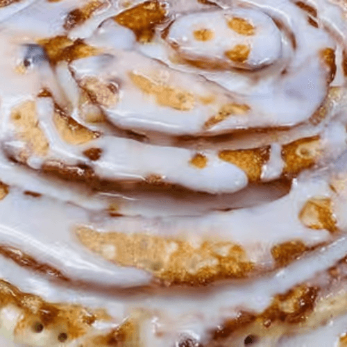 Specially made for you! These two fluffy pancakes feature a swirling spiral of sweet cinnamon roll filling, drizzled with icing
