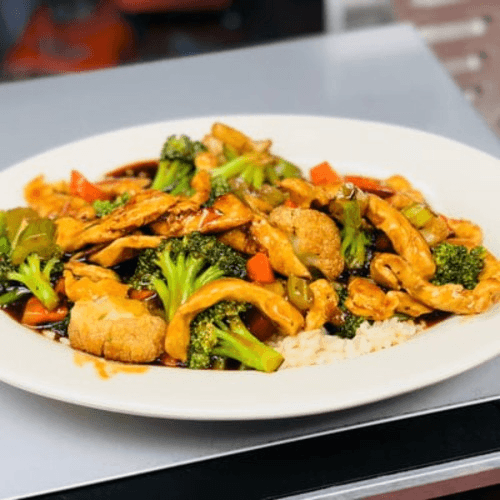 Sizzled with Chinese vegetables and served on a bed of white rice. Served with your choice of one side item. Roll upon request