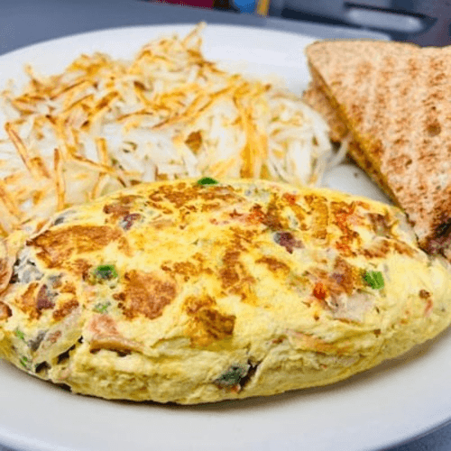 Made with ham, green peppers, onions, mushrooms, tomatoes and cheese. Made with three farm-fresh eggs. Served with hash browns, toast and jelly