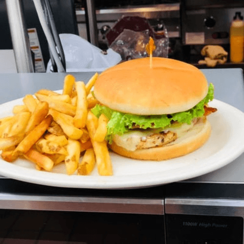 Juicy chicken breast smothered with BBQ sauce upon request and served on a bun