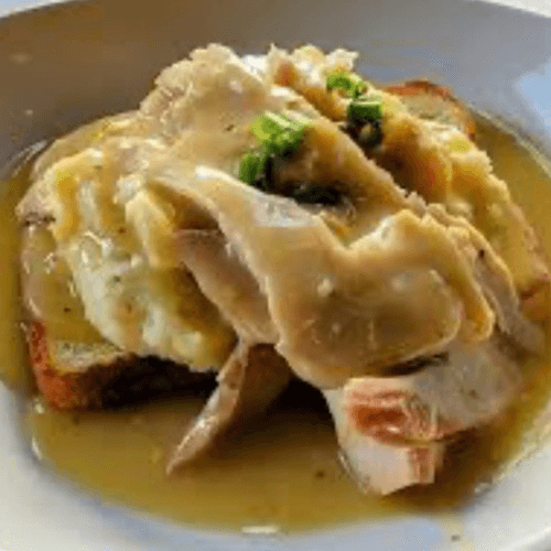 Served open-faced on bread with mashed potatoes covered with homemade gravy